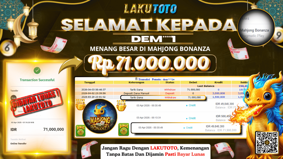 Kategori Bukti Bayar JP BUKTI BAYAR JP Penulis artikel Oleh Operator Lakutoto Tanggal artikel 3 April 2026 MAHJONG BONANZA JUMAT, 03 APRIL 2026 RP 71.000.000 SELAMAT KEPADa PEMENANG, SALAM JP ← BUKTI BAYAR JP → BUKTI BAYAR JP